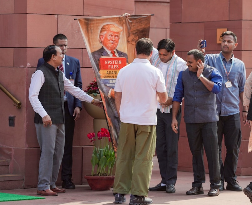 लोकसभा में विपक्ष के नेता राहुल गांधी ने संसद परिसर में धरना दे रहे निलंबित सांसदों से मुलाकात की और उनका समर्थन किया. यह सांसद डोनाल्ड ट्रंप के एक कटआउट के साथ खड़े थे और अमेरिका से ट्रेड डील का विरोध कर रहे हैं. प्रशांत पाडोले और डीन कुरियाकोस समेत आठ सांसद पिछले सप्ताह ‘अमर्यादित व्यवहार’ के कारण सत्र की शेष अवधि के लिए निलंबित कर दिए गए थे. विपक्षी नेता ‘नरेन्द्र सरेंडर’ के पोस्टरों के साथ सरकार के खिलाफ विरोध प्रदर्शन कर रहे हैं. (PTI)