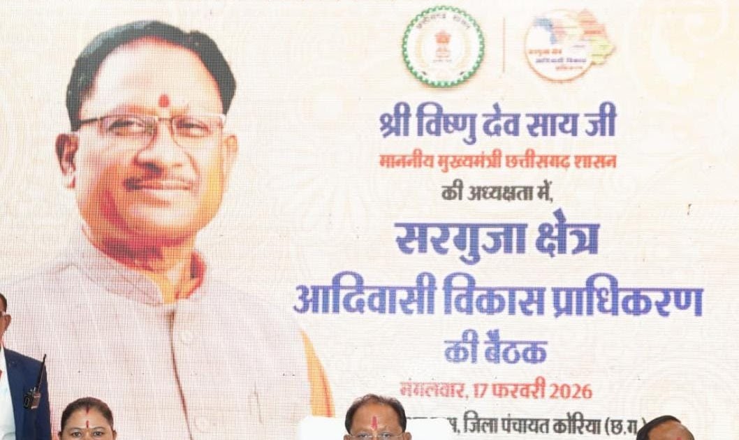 रायपुर 18 फरवरी 2026 मुख्यमंत्री विष्णु देव साय की अध्यक्षता में कोरिया जिले के बैकुंठपुर में आयोजित सरगुजा क्षेत्र आदिवासी विकास प्राधिकरण की बैठक में सरगुजा संभाग के जिलों में संचालित विकास कार्यों की प्रगति की विस्तृत समीक्षा की गई तथा जनप्रतिनिधियों के सुझावों के आधार पर नई योजनाओं को स्वीकृति प्रदान की गई।