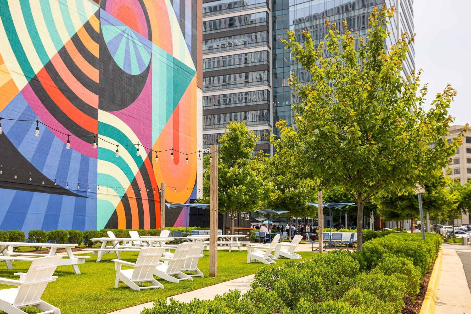 These green and welcoming community gathering spots feature fresh sod lawns, stage areas, and planting beds packed with cheerful plants and flowers. At night, twinkling lights sparkle overhead.