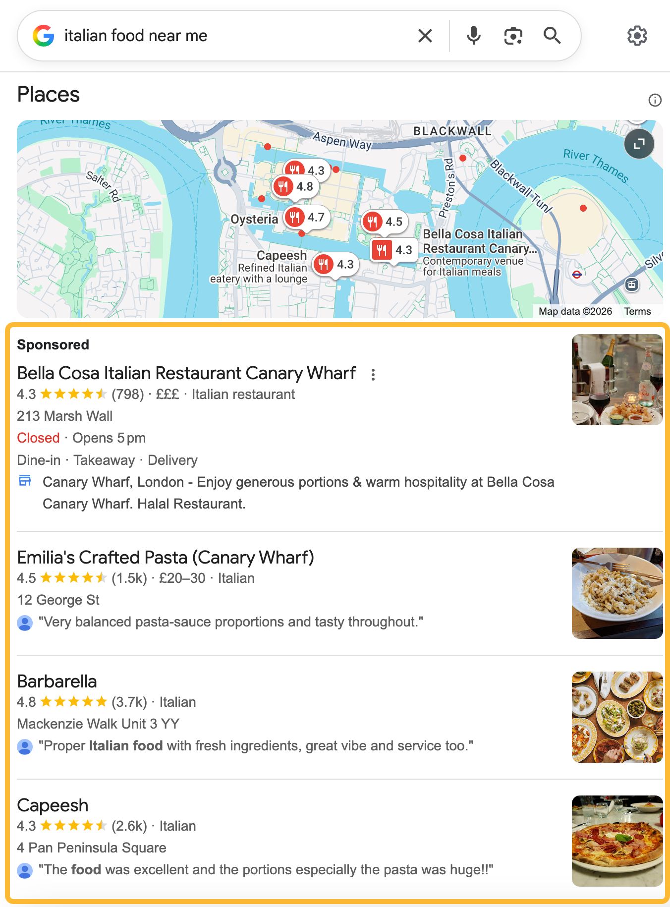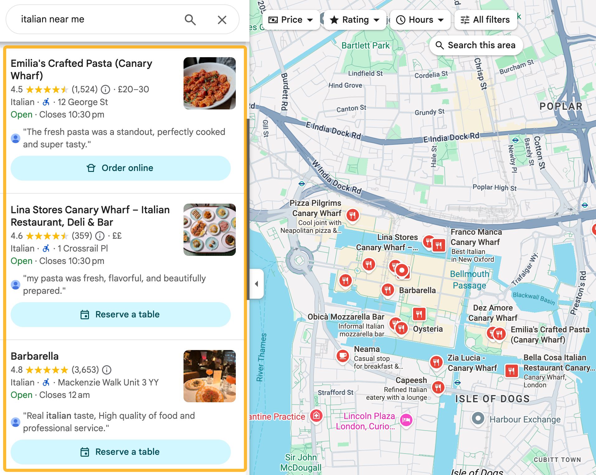- H1 and H2 tags with location keywords. For example: H1: “Authentic Neapolitan Pizza in Canary Wharf” / H2: “Wood-Fired Pizza Made with Italian Ingredients”