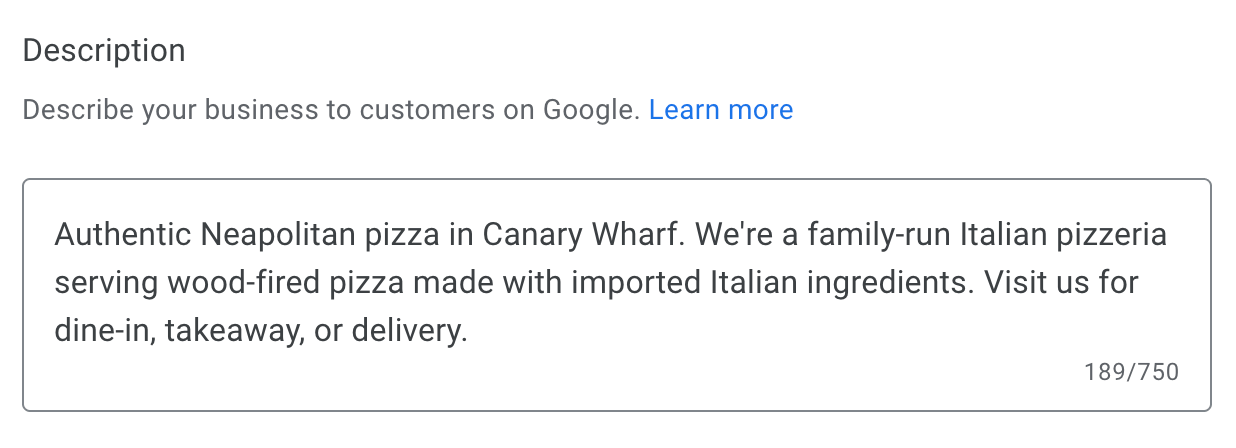 Avoid keyword stuffing your business name (e.g., “Joe’s Pizza | Best Pizza Canary Wharf | Wood Fired Pizza London”). This violates Google’s guidelines and can get you suspended.
