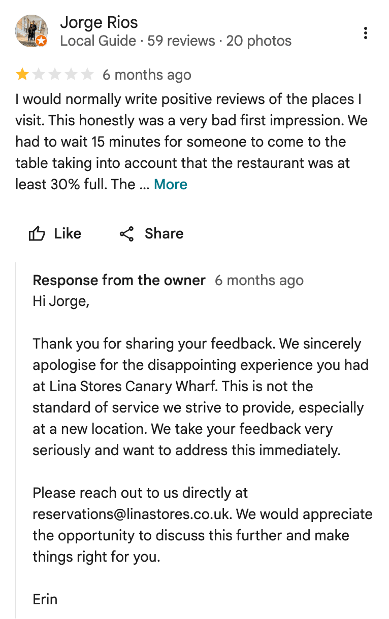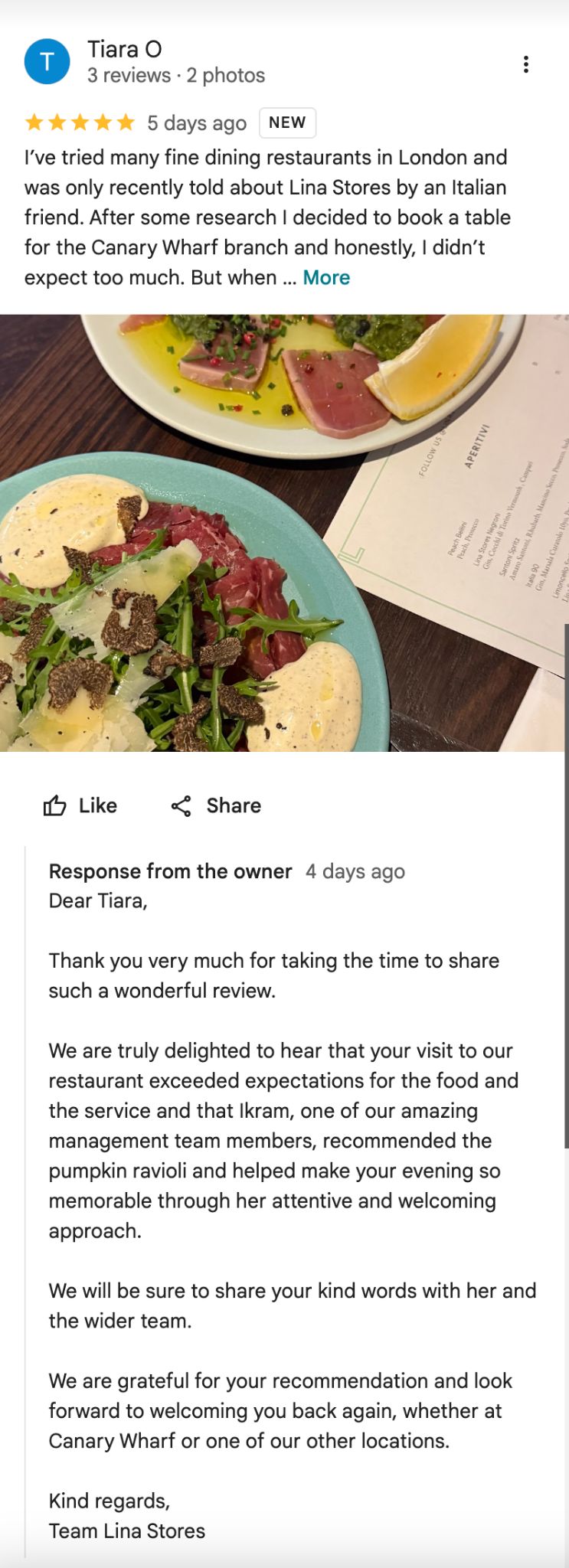 For example, here’s a response from Lina Stores, an Italian restaurant: