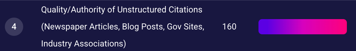 According to Whitespark’s AI Search Visibility data, citations are even more important for appearing in LLM responses. The #4 ranking factor for AI visibility is “Quality/Authority of Unstructured Citations”.