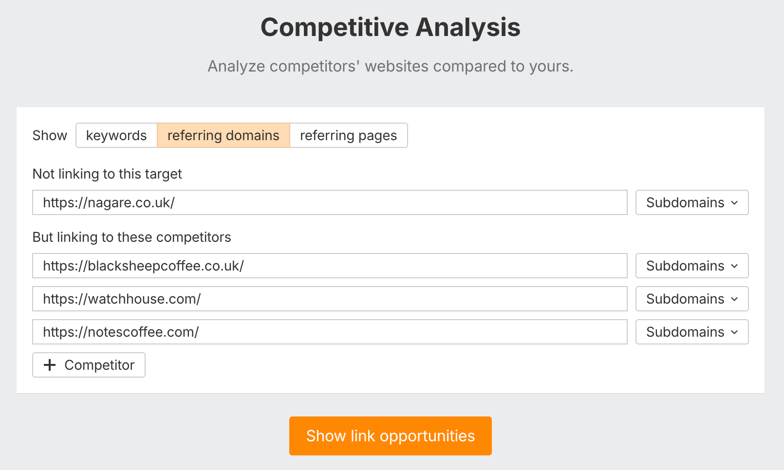 - Add your competitors’ domains in the section for “But linking to these competitors”