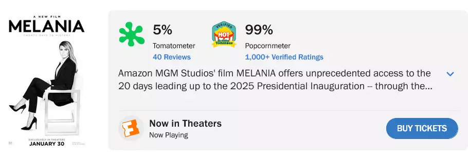 “There has been NO bot manipulation on the audience reviews for the Melania documentary. Reviews displayed on the Popcornmeter are VERIFIED reviews, meaning it has been verified that users have bought a ticket to the film,” a spokesperson said.